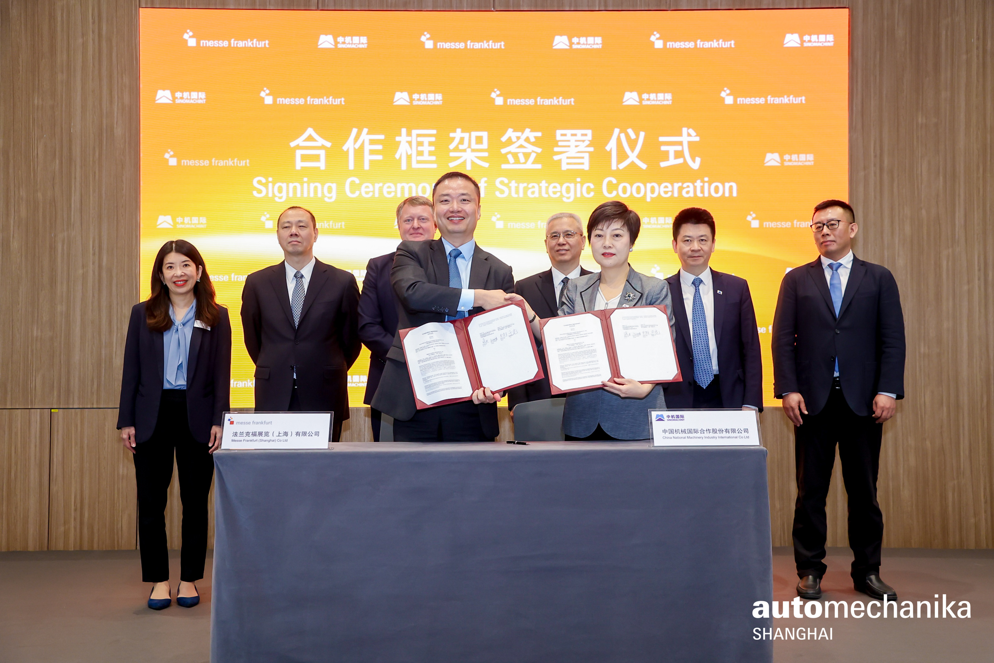 2 月 15 日,上海汽配展 - 深圳特展期间中机国际与法兰克福展览(上海)举行合作框架签署仪式,标志着深化战略合作关系正式开展。法兰克福展览集团董事会成员鲍思丰,国机集团副总经理黎晓煜,中机国际党委书记、董事长夏闻迪见证签约,中机国际总经理张力,法兰克福展览(上海)有限公司总经理于光代表双方签约。中机国际副总经理高润峰,法兰克福展览(香港)有限公司执行董事曹建生,总经理周劭阑一同见证。